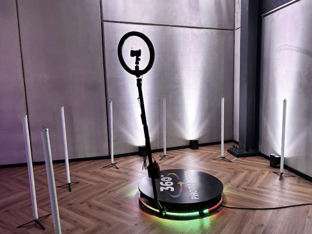 Beim 360booth werden eine oder zwei Personen auf einer Plattform gefilmt, während eine Kamera an einem rotierenden Arm um sie kreist. Das Ergebnis: dynamische Mini-Videoclips, die Bewegungen wie Tanz perfekt in Szene setzen und zu kreativer Interaktion einladen.